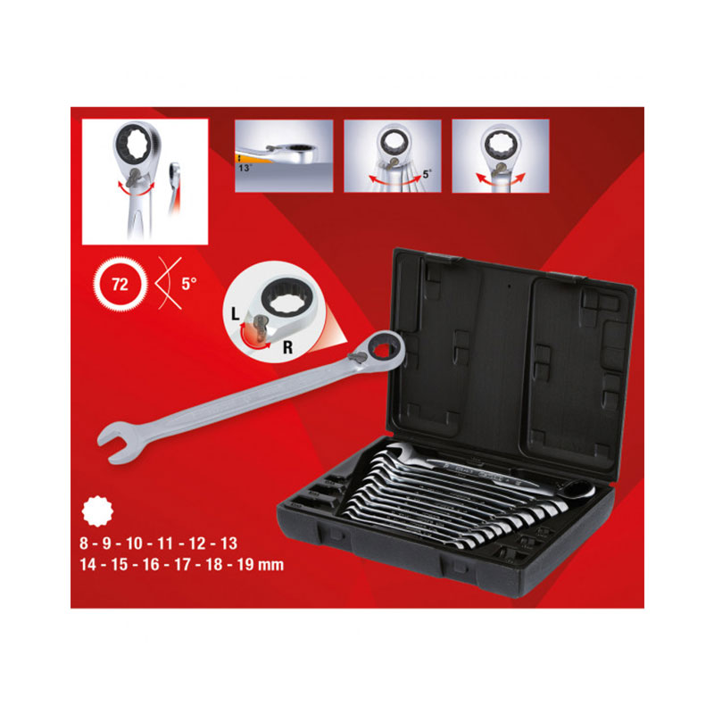Propiedades generales: – Perfil de tracción del flanco; – Cumple la norma DIN 3113 / ISO 3318; – Posición de la boca en ángulo de 15°; – Cabeza de carraca en ángulo de 15°; – Con diente de precisión de 72 dientes; – Con palanca basculante; – Con un acabado satinado muy fino; – Cromo vanadio; – Se presenta en un robusto maletín de plástico;